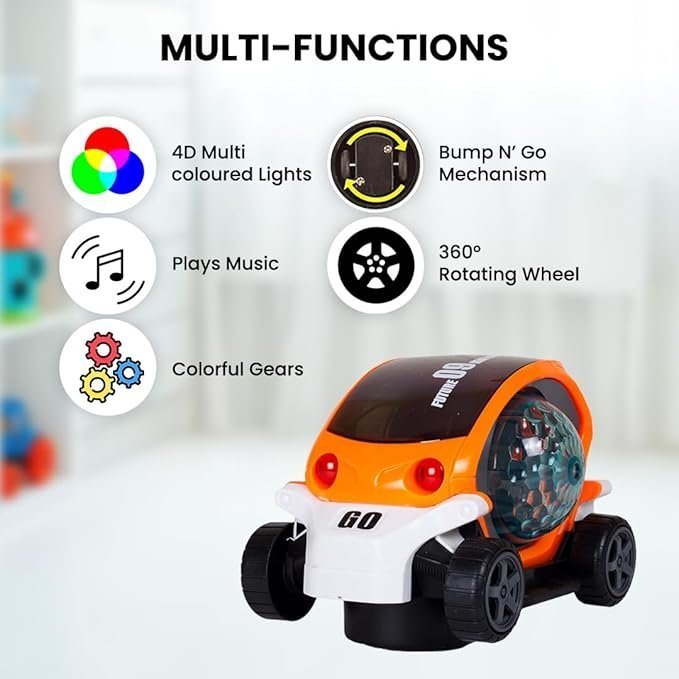 - Fuel The Excitement: A car toy that takes fun to fast and furious extremes! This transparent toy car for kids is crammed with features. It lights up, it plays music, it moves on its own, and it even has colorful gears that turn in spectacular style for hours of fun.