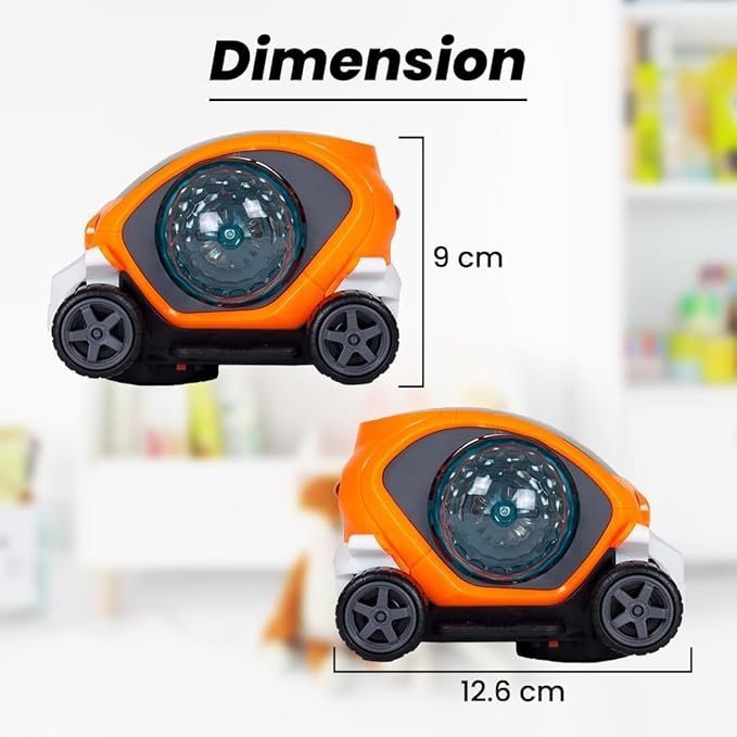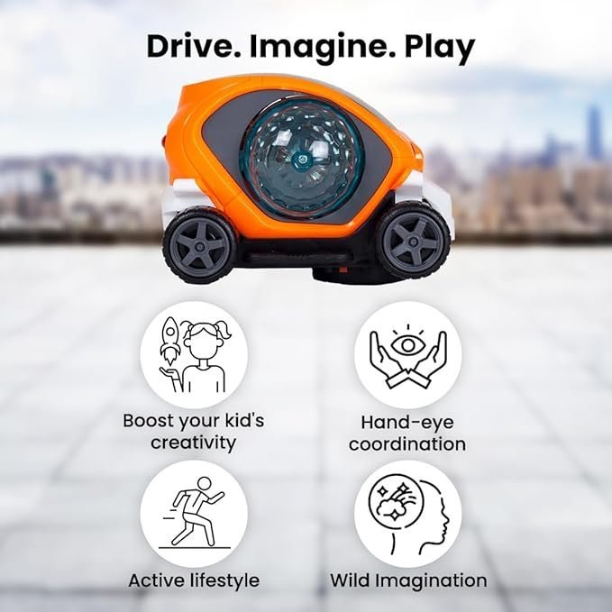 - Random Movement: The car has a 360° rotating wheel in the middle. The wheel supports random movement. This feature makes the car fun to play with and it keeps the kid curious, as it does not have a dedicated path or trajectory to follow.